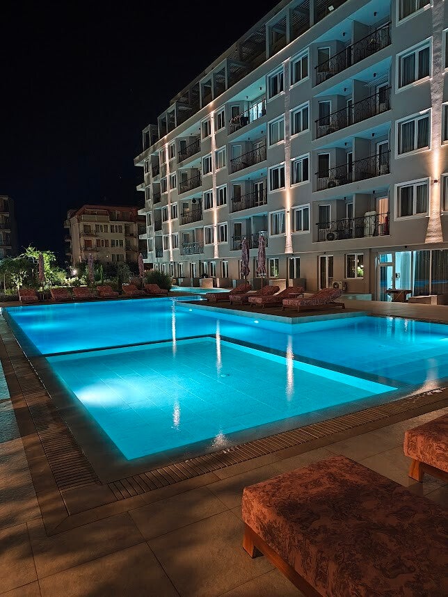 Discover J'Adore Secret Garden, a luxurious holiday apartment in Sunny Beach, Bulgaria. Perfect for couples and families of up to four seeking comfort, tranquility, and elegance. The beautifully designed apartment, meticulously designed, offers two private balconies for complete privacy. Guests also enjoy a well-maintained swimming pool, creating a calm and exclusive holiday atmosphere. Enjoy an unforgettable stay.